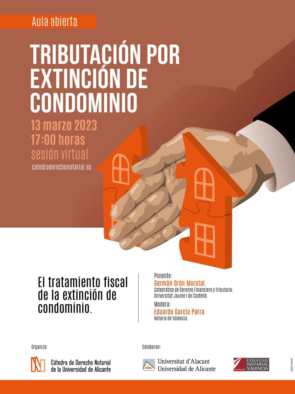 La Cátedra de Derecho Notarial de la Universidad de Alicante, creada por acuerdo de la Universidad y el Colegio Notarial de Valencia, organiza una nueva sesión de debate virtual, en esta ocasión, sobre el tratamiento fiscal de la extinción de condominio.