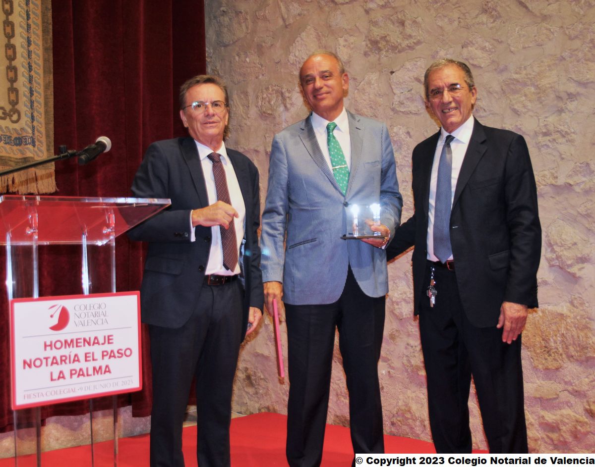 José Manuel Lorenzo Riverol, trabajador del Ayuntamiento de El Paso, recogiendo la condecoración, junto al decano y al vicedecano del Colegio Notarial de Valencia