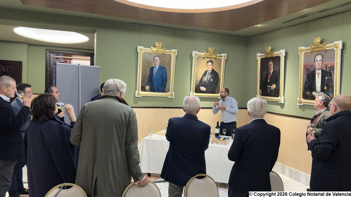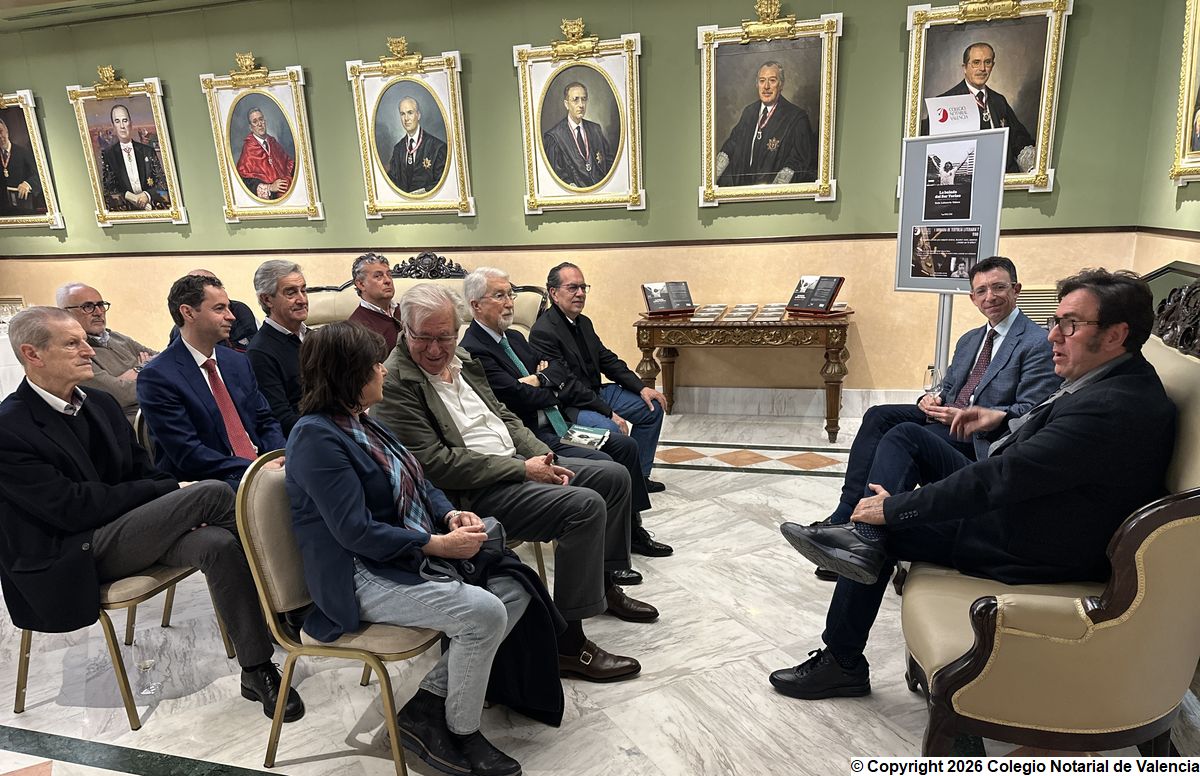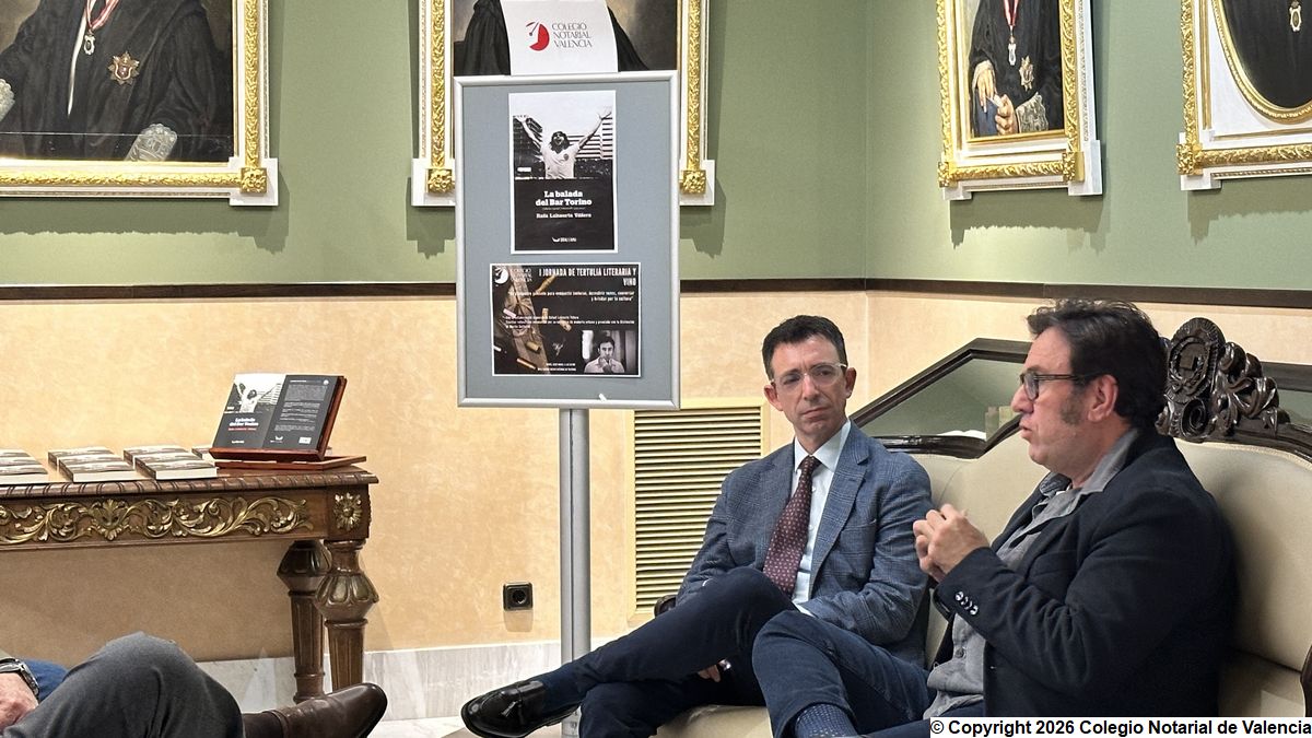 Imatge general de la Galeria de Degans del Col·legi Notarial de València en el moment de tertúlia literària amb l'escriptor Rafael Lahuerta Yúfera, acompanyat pel degà del Col·legi Notarial de València, José Carmelo Llopis Benlloch