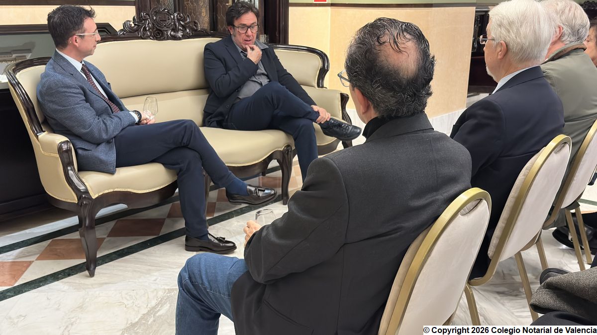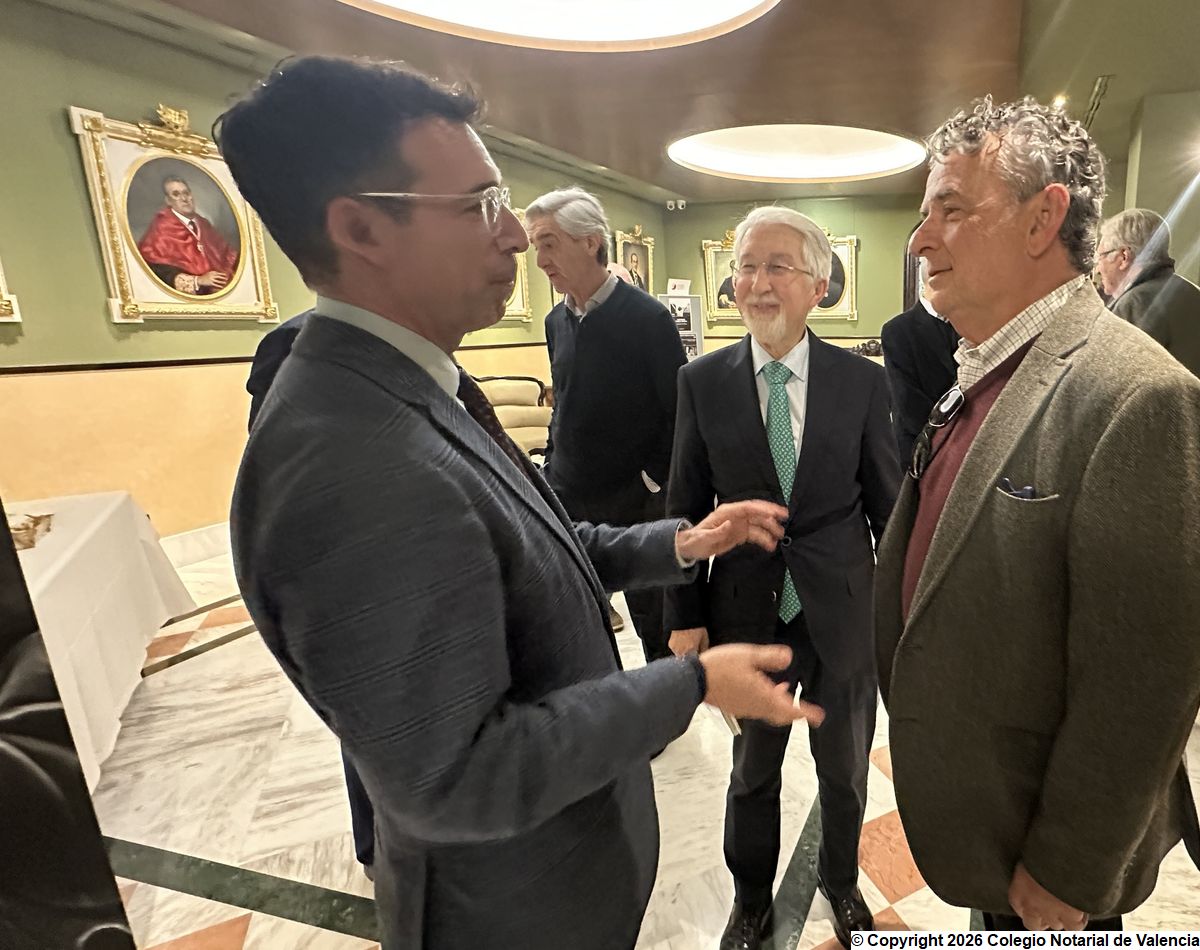 Un moment de la benvinguda del degà del Col·legi Notarial de València, José Carmelo Llopis Benlloch, al costat de l'escriptor Rafael Lahuerta Yúfera