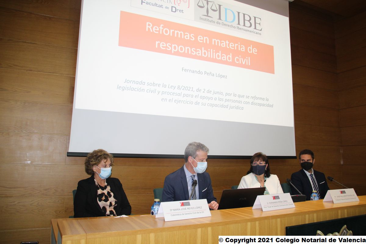 El Colegio Notarial de Valencia y la Universitat de València, por medio del proyecto de investigación AICO/2021/090 "La modernización del Derecho de Familia a través de la práctica jurisprudencial", han organizado una jornada donde se ha abordado la Ley 8/2021, de 2 de junio, por la que se reforma la legislación civil y procesal para el apoyo a las personas con discapacidad en el ejercicio de su capacidad jurídica. En concreto, académicos, juristas y notarios han analizado la incidencia de la reforma en las profesiones jurídicas, así como las reformas incluidas en materia de sucesiones, responsabilidad civil y familia.