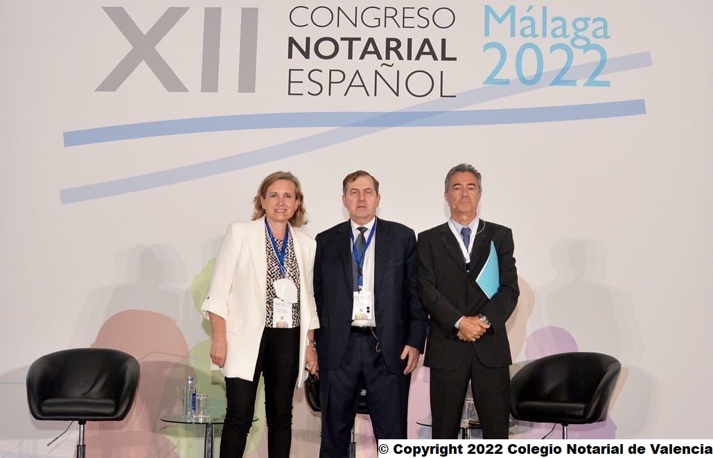 Imagen general en el momento de la intervención del notario de Valencia, Ubaldo Nieto, junto al catedrático de Derecho civil de la Universidad de Málaga, José Manuel Ruiz-Rico; y la catedrática de la Universidad de Barcelona, actuaria y directora de la revista Anales del Instituto de Actuarios Españoles, Mercedes Ayuso