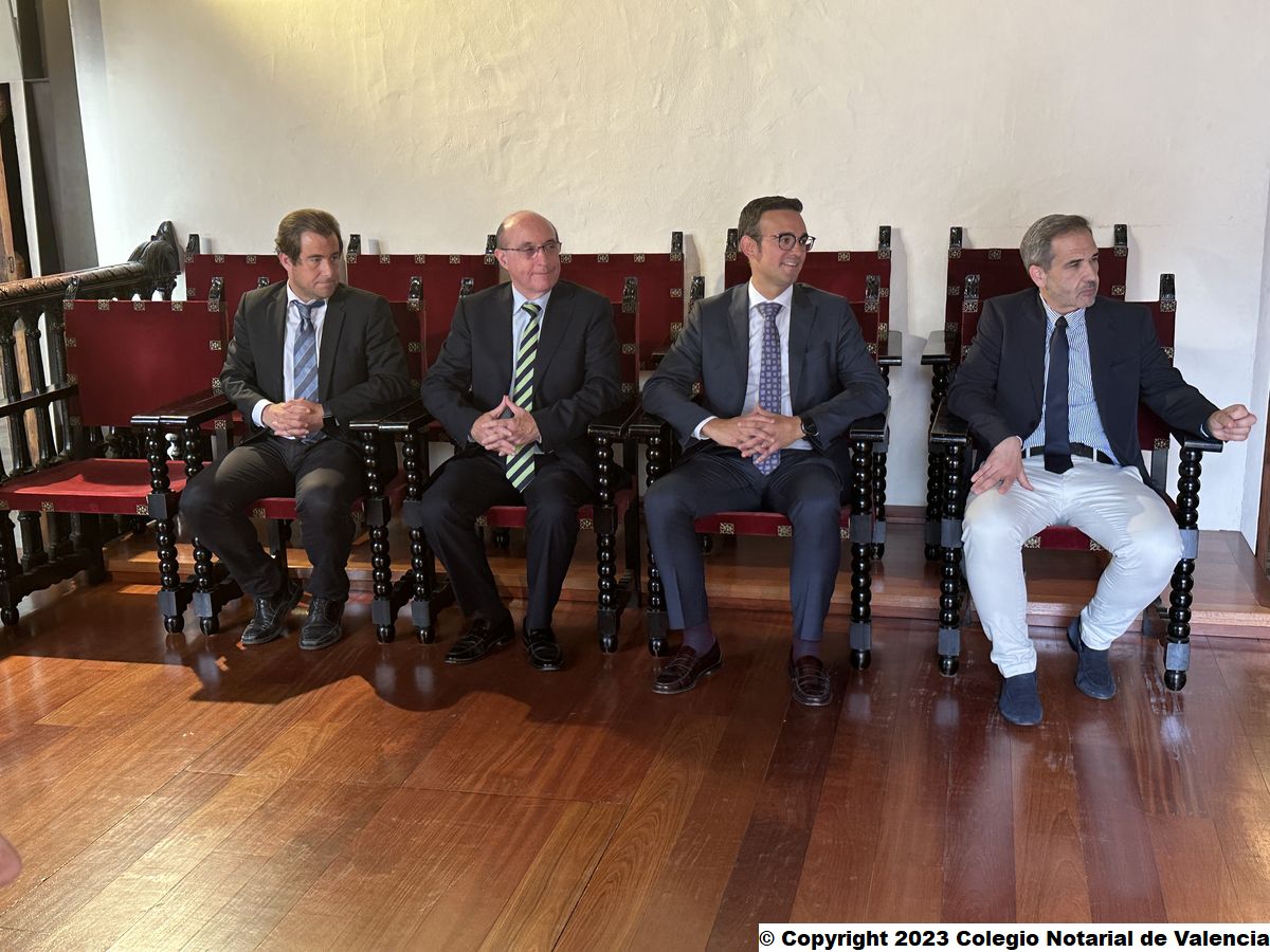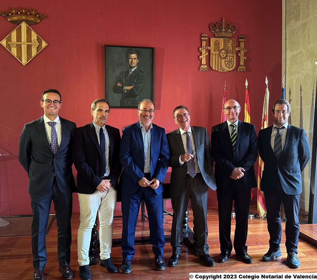 En este sentido, el edificio consistorial ha acogido la firma de este convenio entre su alcalde, Diego Gómez García, y el decano del Colegio Notarial de Valencia, Francisco Cantos Viñals. Los notarios de Alzira, Miguel Ildefonso Gallut Ortega, José Juan Llobregat Vaya, Federico Palasí Roig y Ricardo Tabernero Capella, también han asistido a esta firma entre ambas entidades, al igual que los técnicos municipales, Carlos Capella (secretario), Agnés Xelvi (tesorera) y Javier Comas (jefe de negociado del Departamento de Gestión Tributaria).
