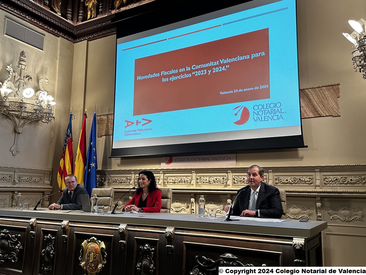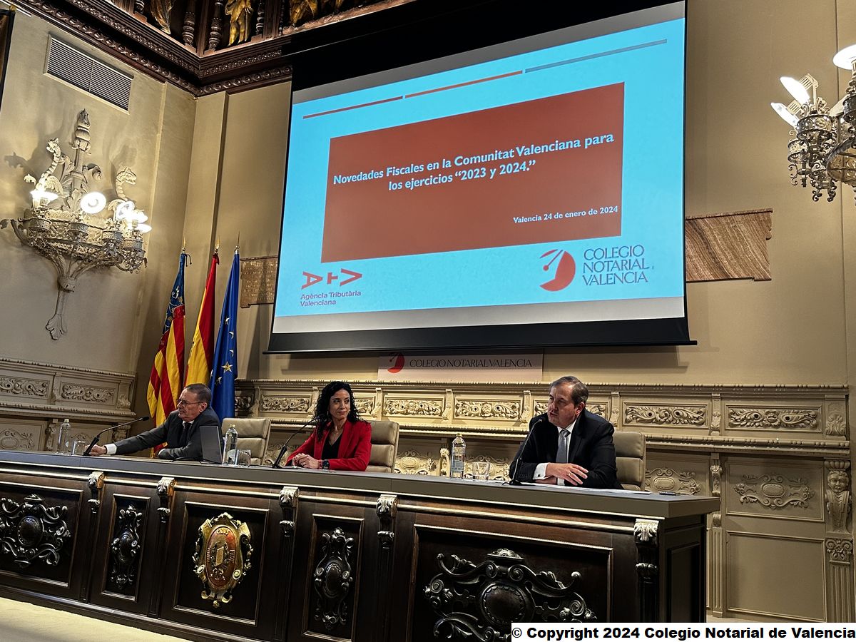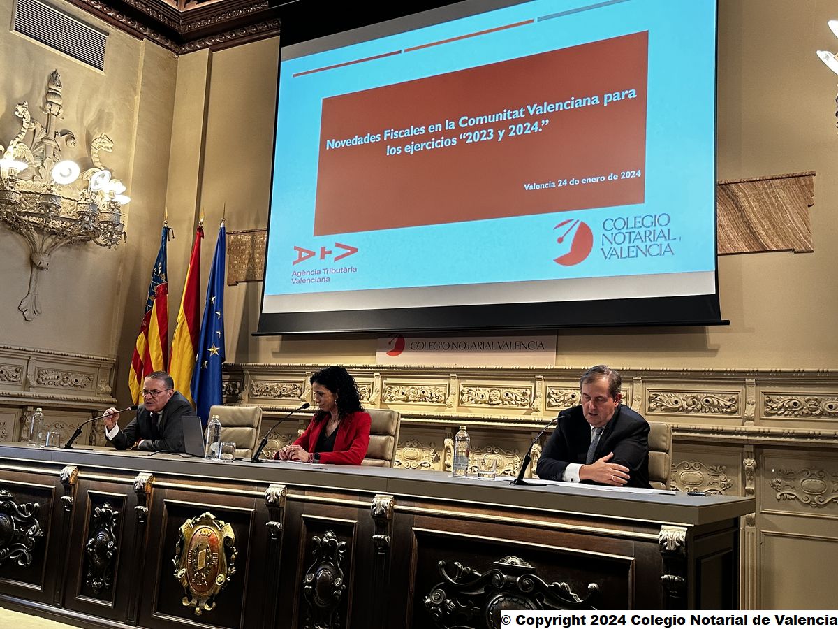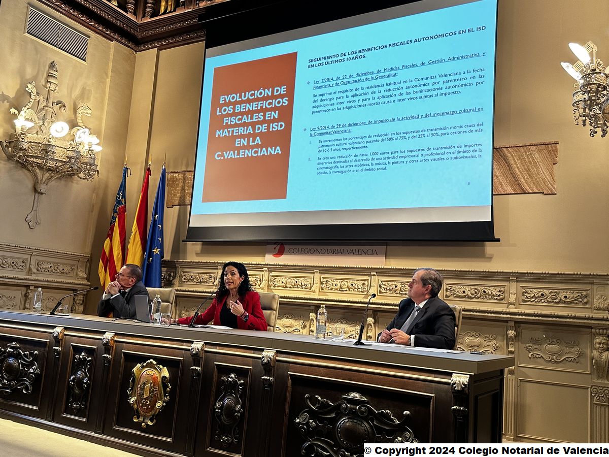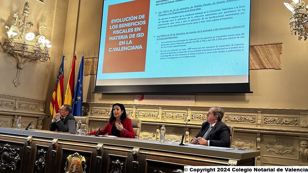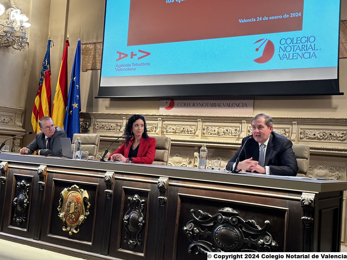 La directora general de la Agencia Tributaria Valenciana, Sonia Díaz Español, antes de dar comienzo su intervención, junto al decano del Colegio Notarial de Valencia, Francisco Cantos Viñals; y al notario de Valencia, Ubaldo Nieto Carol