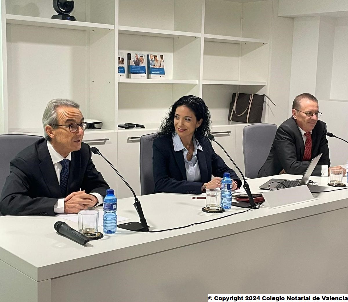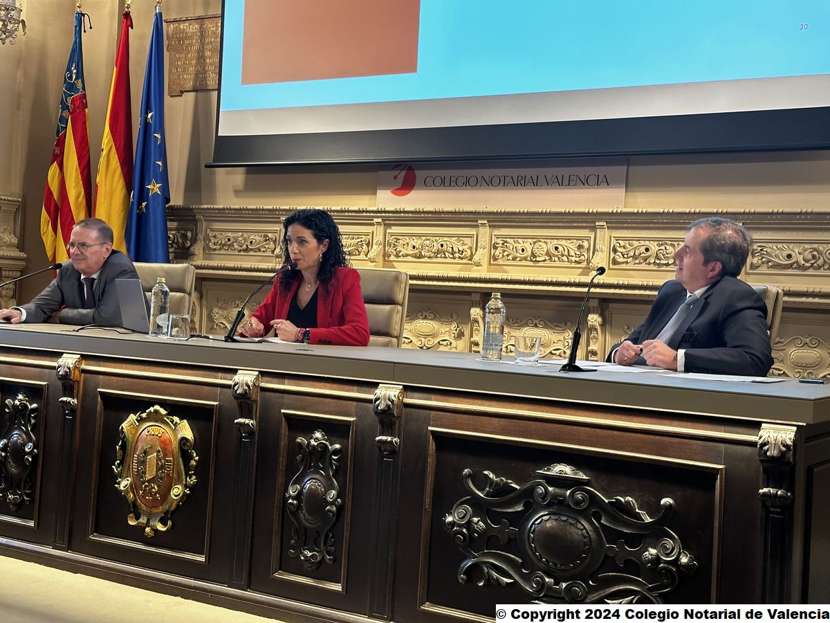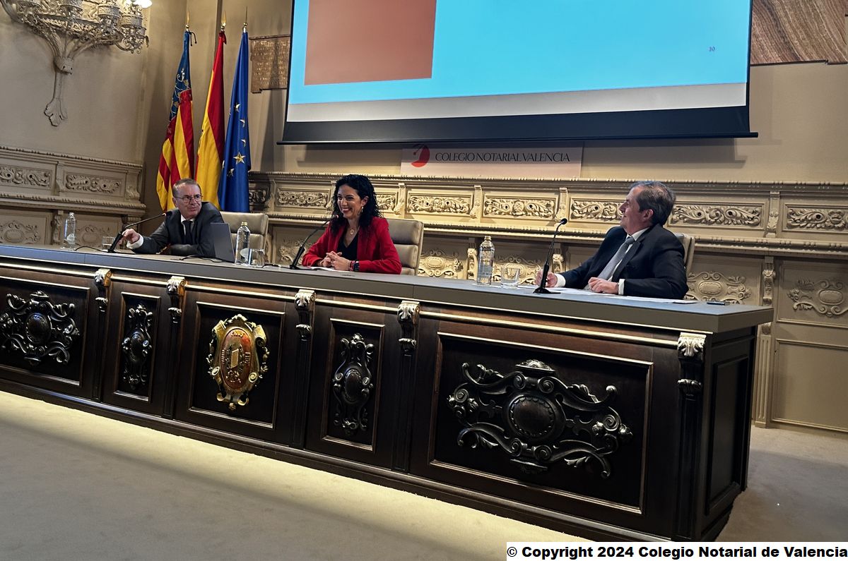 Un momento del final de la intervención de la directora general de la ATV, Sonia Díaz Español, junto al decano del Colegio Notarial de Valencia, Francisco Cantos Viñals; y al notario de Valencia, Ubaldo Nieto Carol