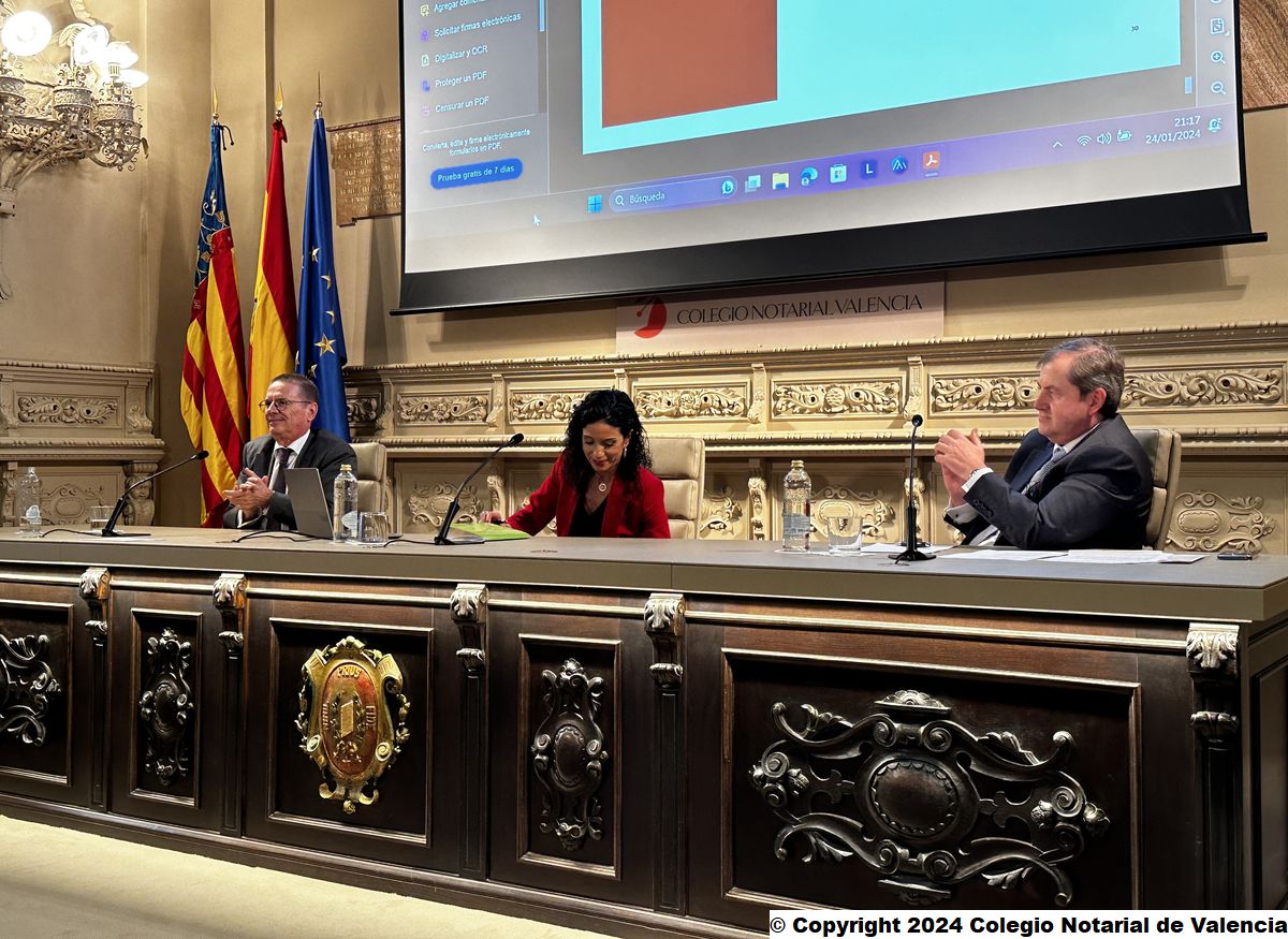 Un momento de la intervención de la directora general de la ATV, Sonia Díaz Español, junto al decano del Colegio Notarial de Valencia, Francisco Cantos Viñals; y al notario de Valencia, Ubaldo Nieto Carol
