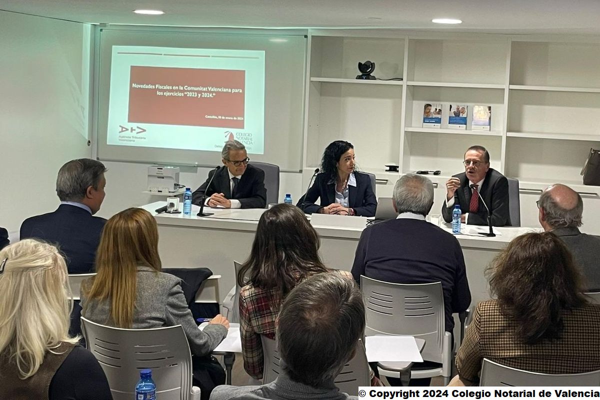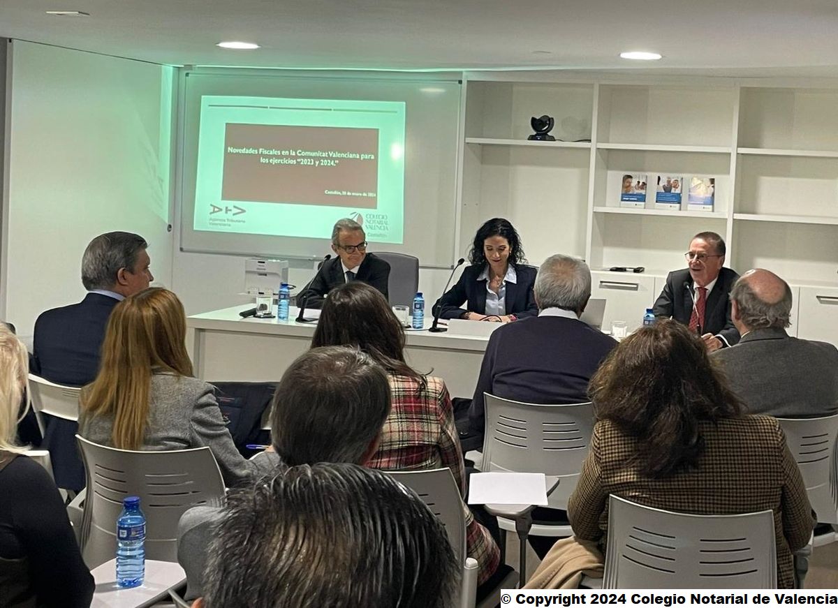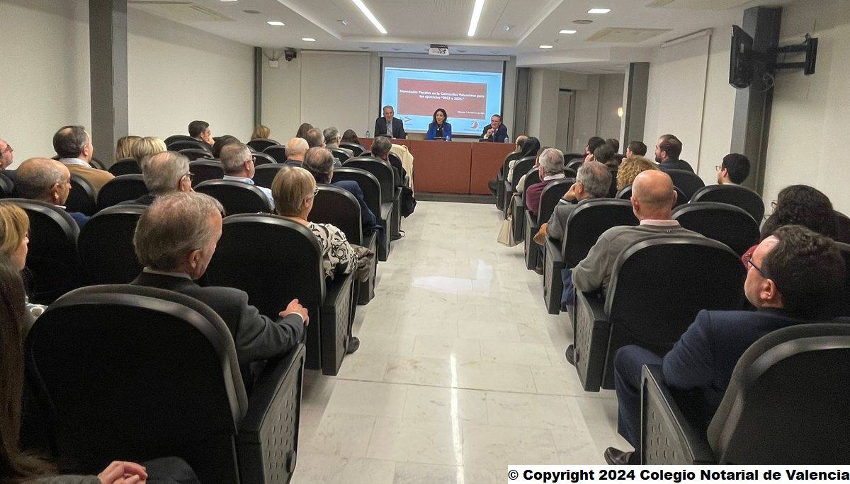 Imagen general de miembros de la junta directiva del Colegio Notarial de Valencia, de cargos colegiales y de notarios de la provincia, asistiendo a la conferencia de la directora general de la Agencia Tributaria Valenciana