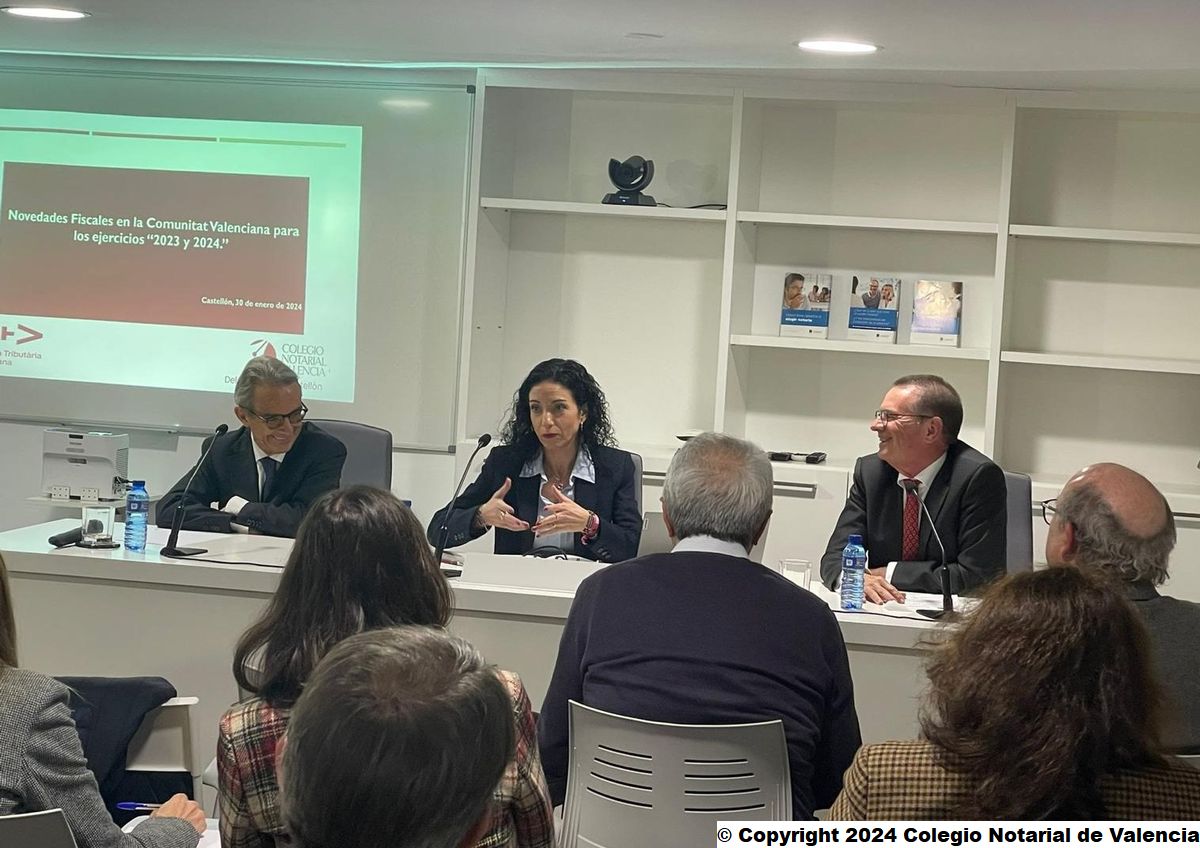 Imagen de la delegación de Castellón del Colegio Notarial, en el momento de la presentación por parte del decano del Colegio Notarial de Valencia, Francisco Cantos Viñals; dando paso a la intervención de la directora general de la ATV, Sonia Díaz Español