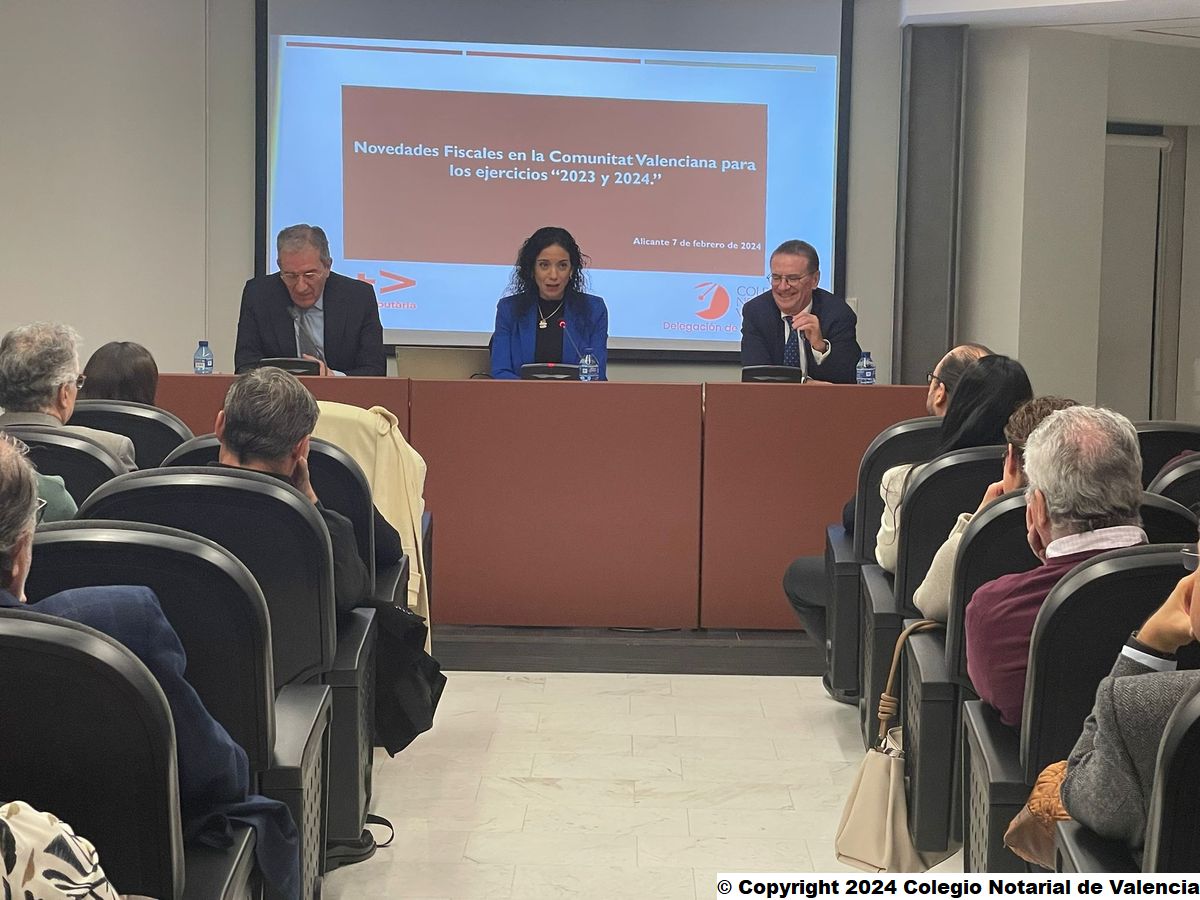 Un momento de la intervención de la directora general de la ATV, Sonia Díaz Español, en la delegación de Alicante del Colegio Notarial; junto al decano del Colegio Notarial de Valencia, Francisco Cantos Viñals; y al vicedecano y notario de Alicante, Delfín Martínez, en la conferencia impartida para notarios y empleados de notaría de la provincia de Alicante