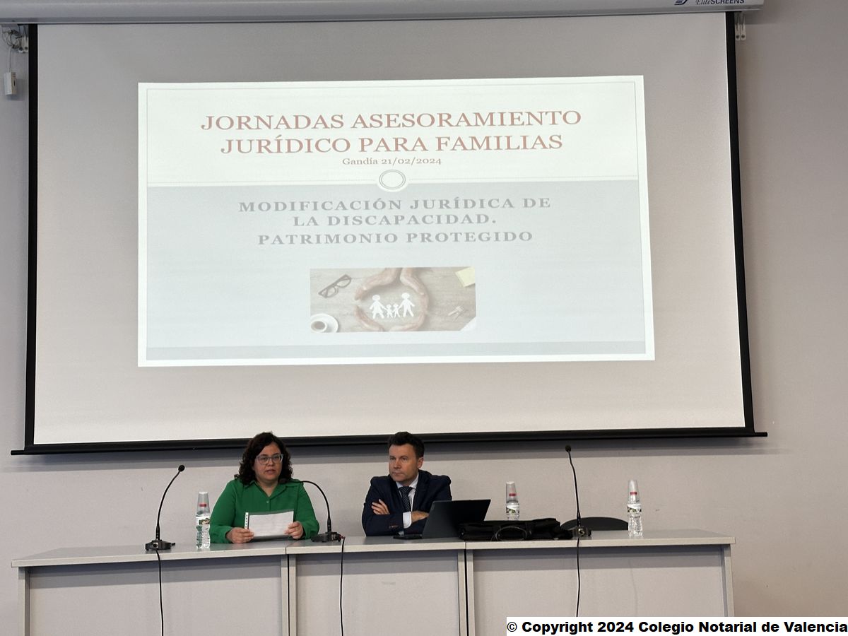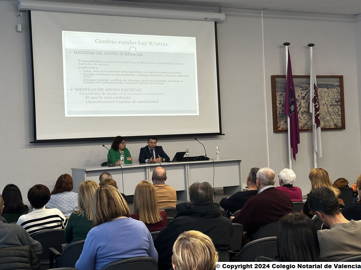 La secretaria de ASTEA SAFOR, Raquel Santiago, acompaña en mesa al notario Gonzalo Cano en su conferencia sobre las medidas de protección para las personas con discapacidad, que se celebra en la sala de conferencias del edificio Fomento Safor, para socios, familias de la asociación y profesionales dedicados a la protección de las personas con discapacidad.