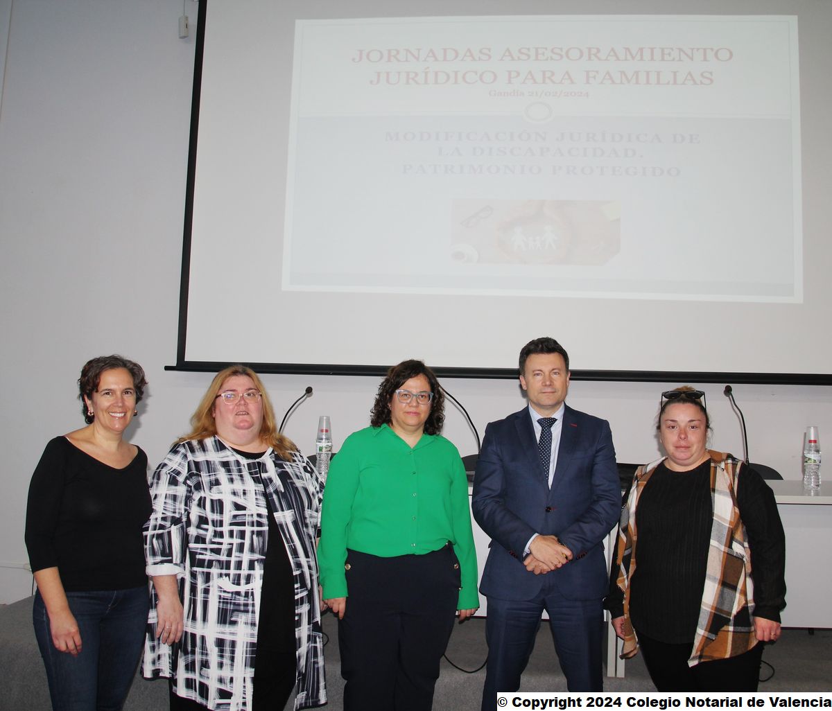 Imagen del notario de Gandia, Gonzalo Cano Mora, junto a las representantes de la Asociación ASTEA Safor, de familiares de personas con trastorno del espectro autista, tras la conferencia impartida en Gandia