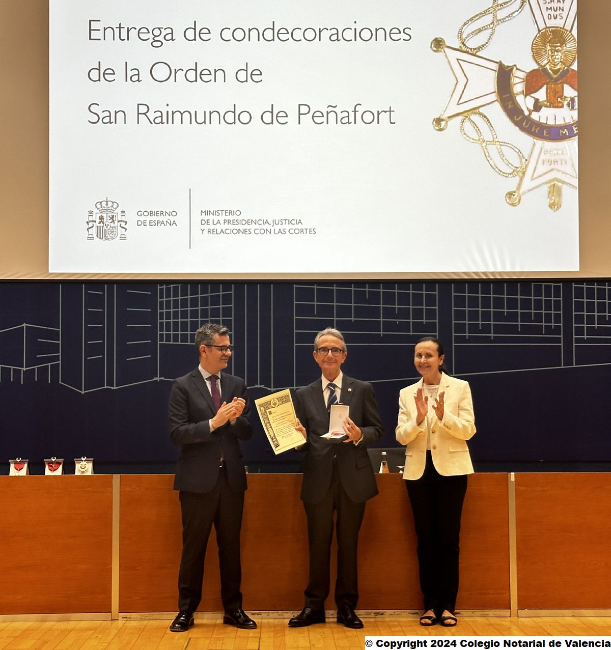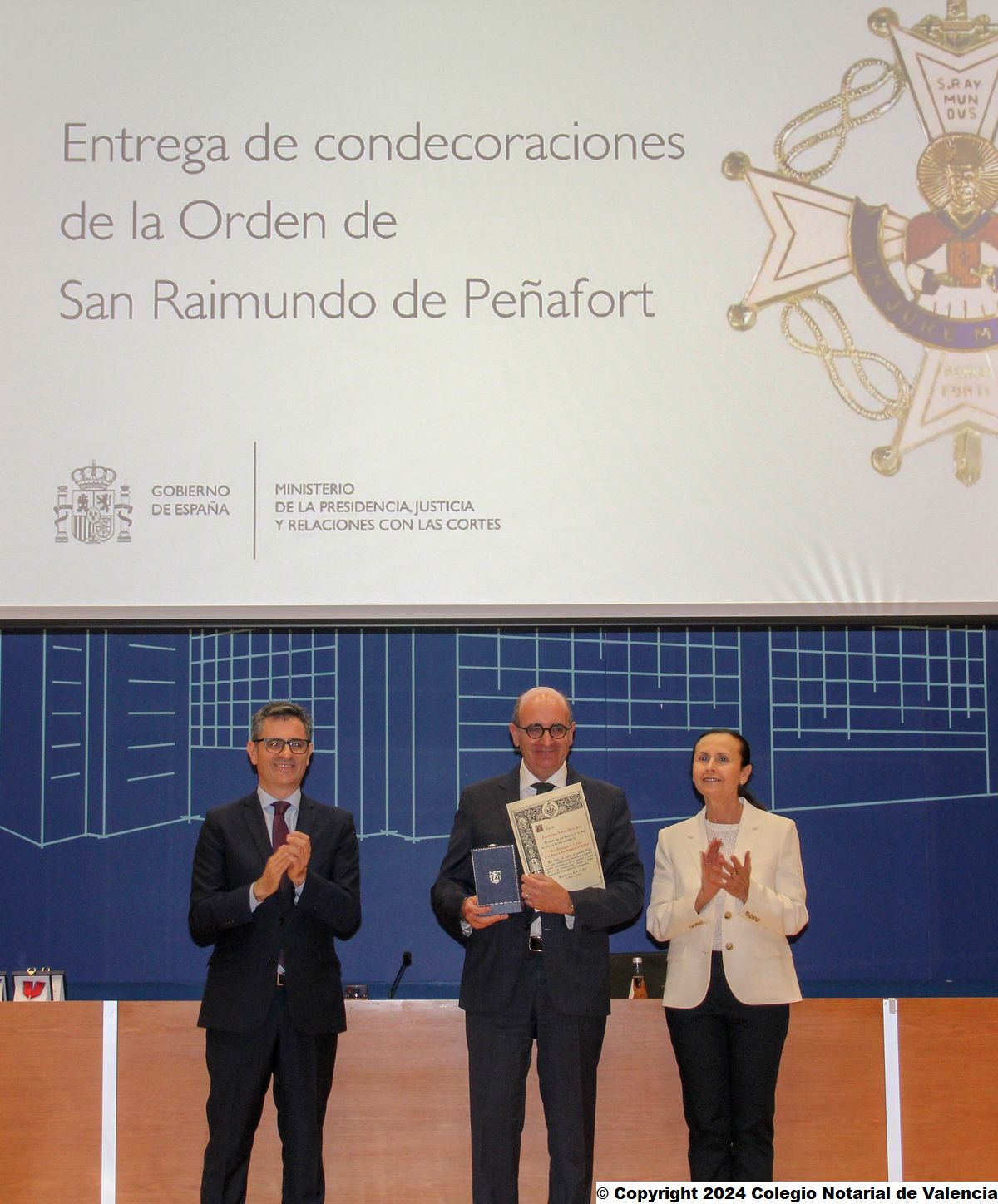 El ministro de la Presidencia, Justicia y Relaciones con las Cortes, Félix Bolaños, entregó el martes,16 de abril, en la ciudad de Valencia las condecoraciones de la Orden de San Raimundo de Peñafort, concedidas por el Ministerio en años anteriores con motivo del Aniversario de la Constitución de 1978, el 6 de diciembre; y del Aniversario de la Proclamación de S.M. El Rey, el 19 de junio, a destacados profesionales jurídicos de la Comunitat, entre ellos, un notario de la ciudad de Valencia y dos notarios de Castellón, y que no pudieron ser entregadas al no celebrarse acto por las restricciones sanitarias en pandemia: Eduardo García Parra, José Vicente Malo Concepción y Ernesto Tarragón Albella.