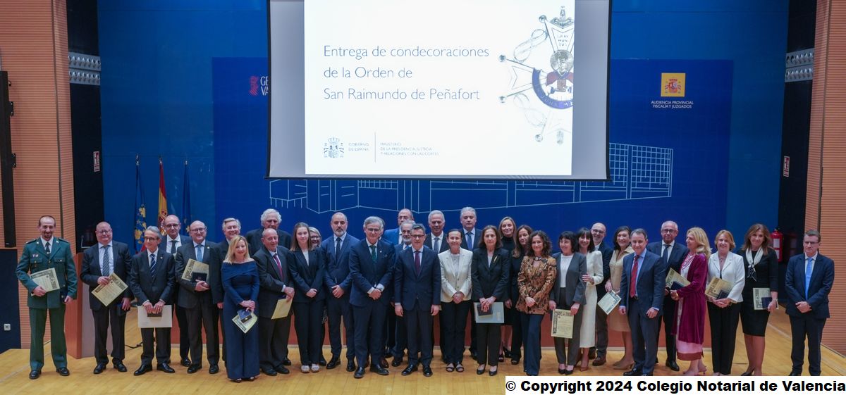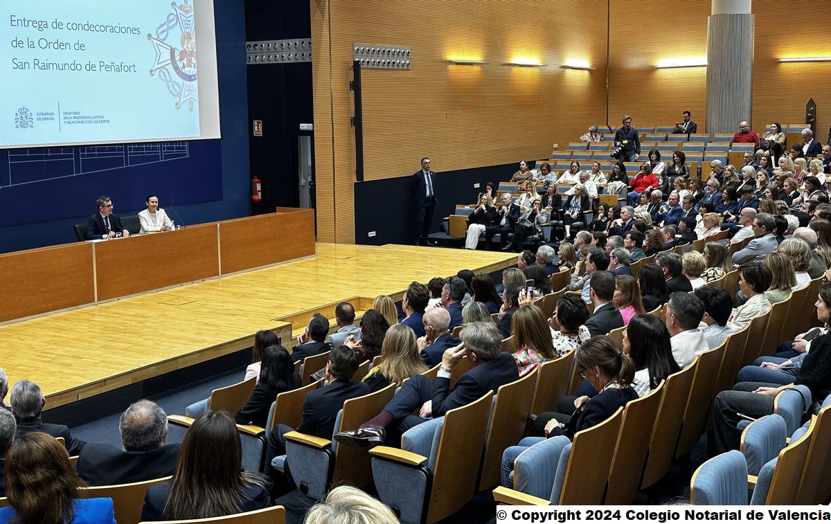 La Ciudad de la Justicia de Valencia ha albergado este acto donde el ministro ha hecho entrega de la Cruz Distinguida de 1ª Clase de la Orden de San Raimundo de Peñafort a 32 profesionales de la CV que han destacado por su compromiso y dedicación a la Justicia, entre ellos el notario de Valencia, Eduardo García Parra (condecoración concedida en junio de 2022); y los notarios de Castellón, José Vicente Malo Concepción (concedida en junio de 2021) y Ernesto Tarragón Albella (concedida en diciembre de 2020). La Cruz reconoce el mérito jurídico y los servicios prestados de estos tres notarios como fedatarios públicos en el estudio y desarrollo del Derecho.
