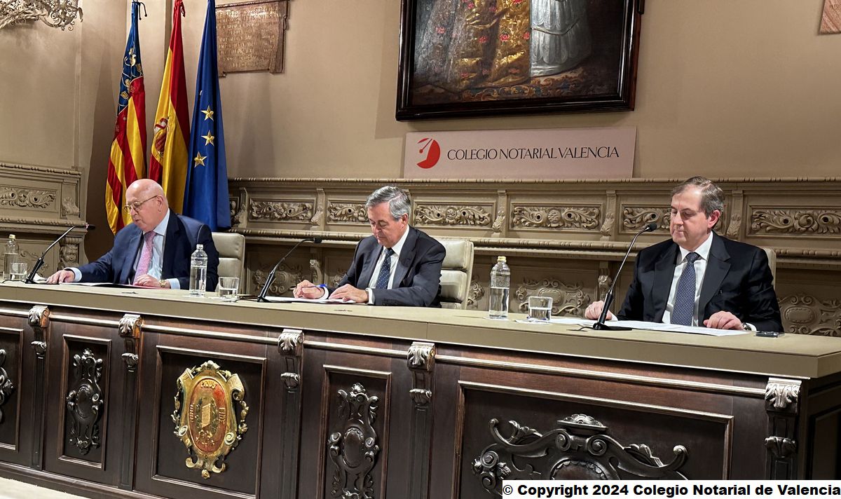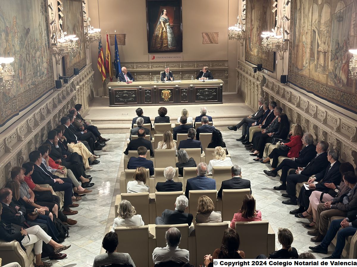 Imagen general de las autoridades asistentes a la conferencia, en el Salón de Actos del Colegio Notarial, junto a los miembros de la Junta Directiva y cargos colegiales del Colegio Notarial de Valencia