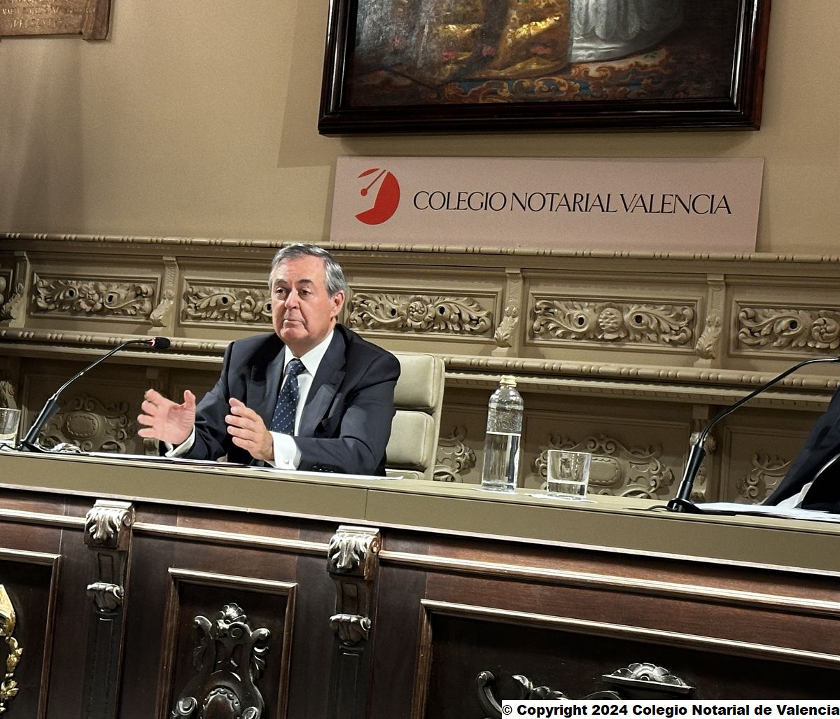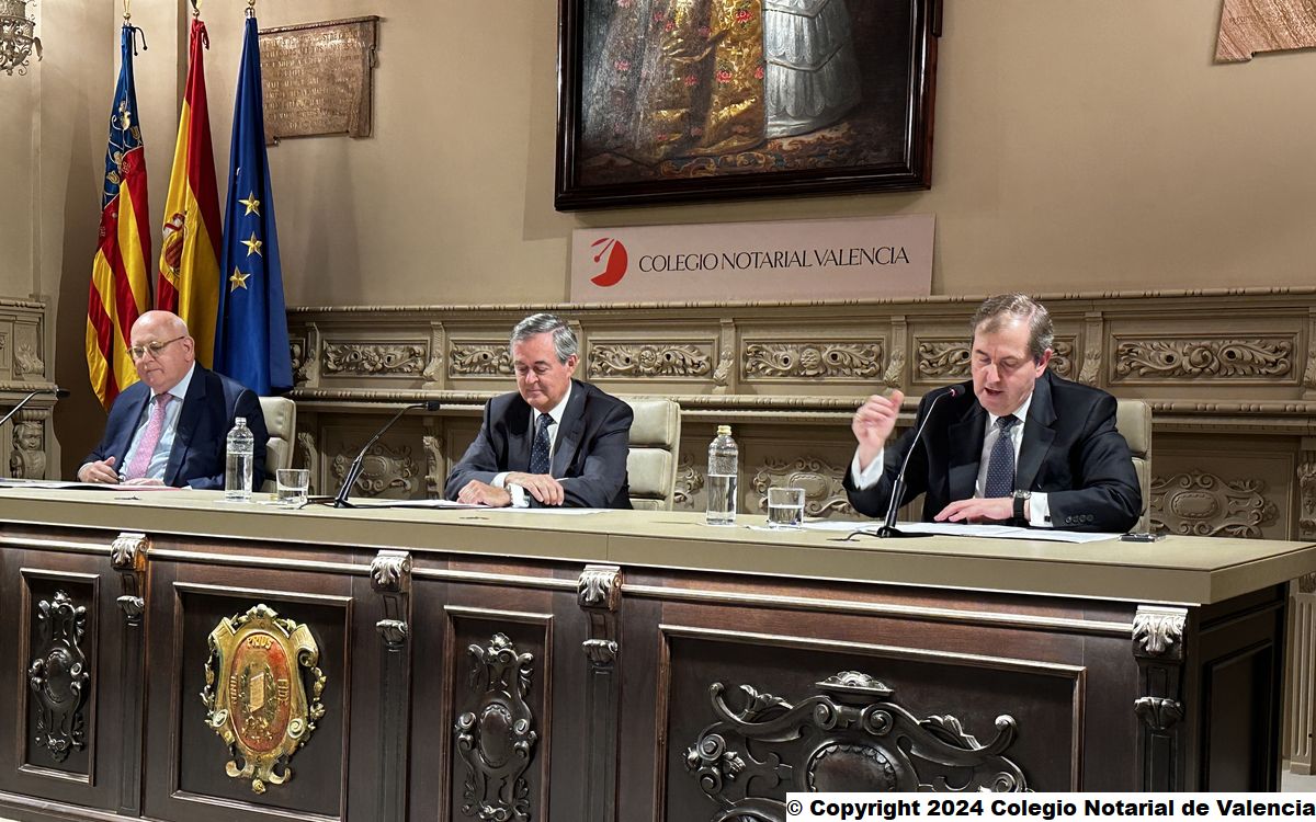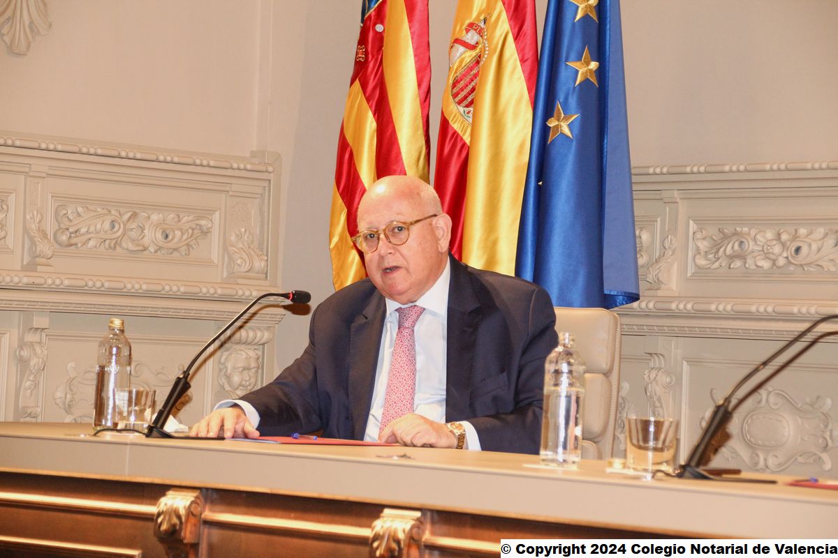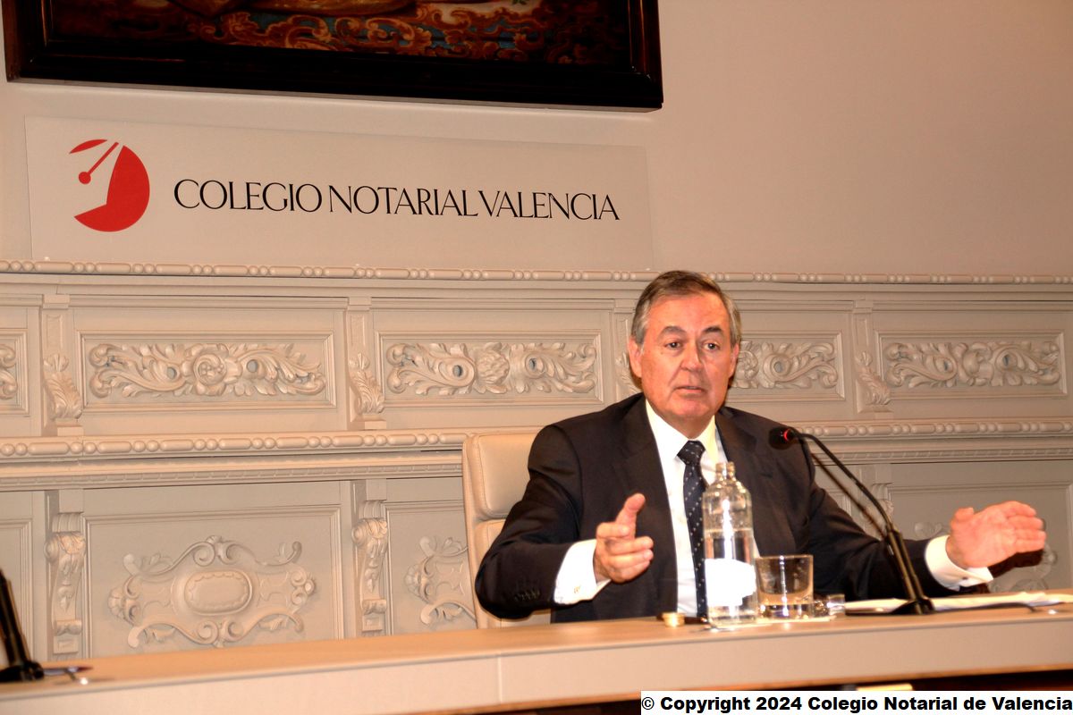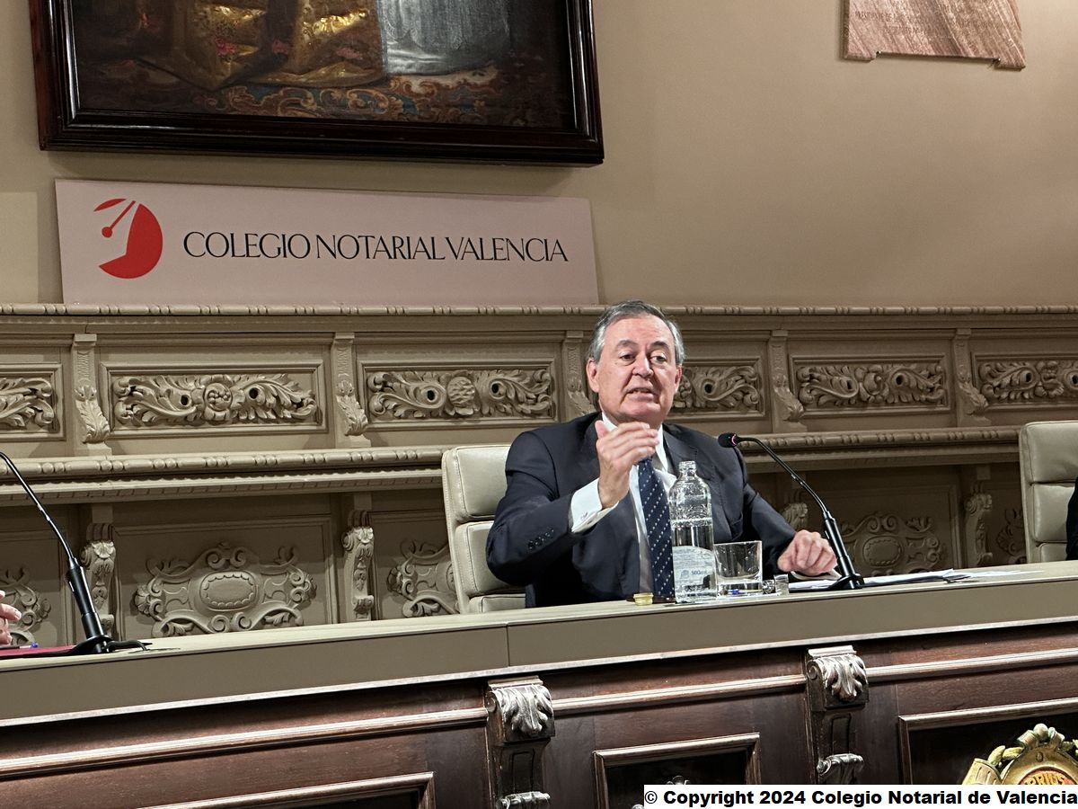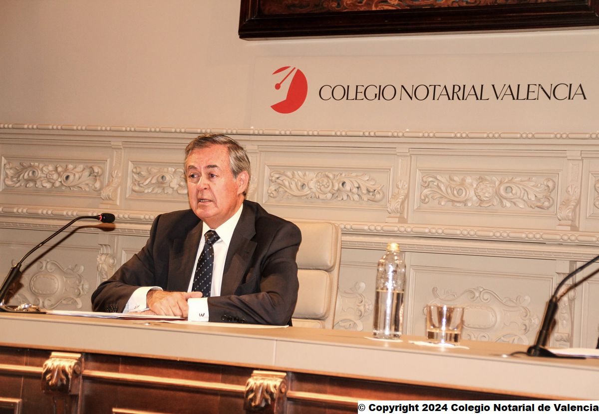 Imagen de un momento de la intervención del secretario de la Junta Directiva del Colegio Notarial de Valencia, José María Cid Fernández, dando la bienvenida a los asistentes a la conferencia de Juan Emilio Iranzo Martín
