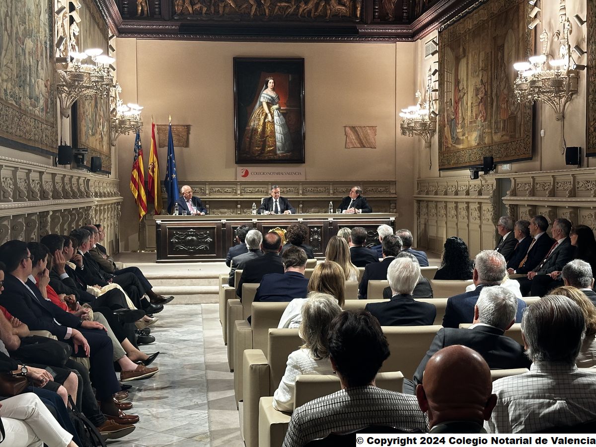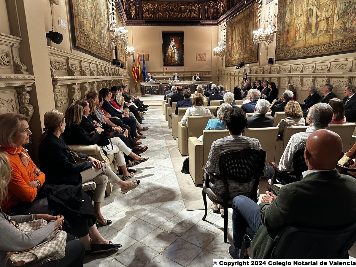 Imagen general del Salón de Actos del Colegio Notarial de Valencia en el momento de la intervención del catedrático de Derecho de Economía Aplicada de la UNED y académico de Número de la RADE, Juan Emilio Iranzo Martín