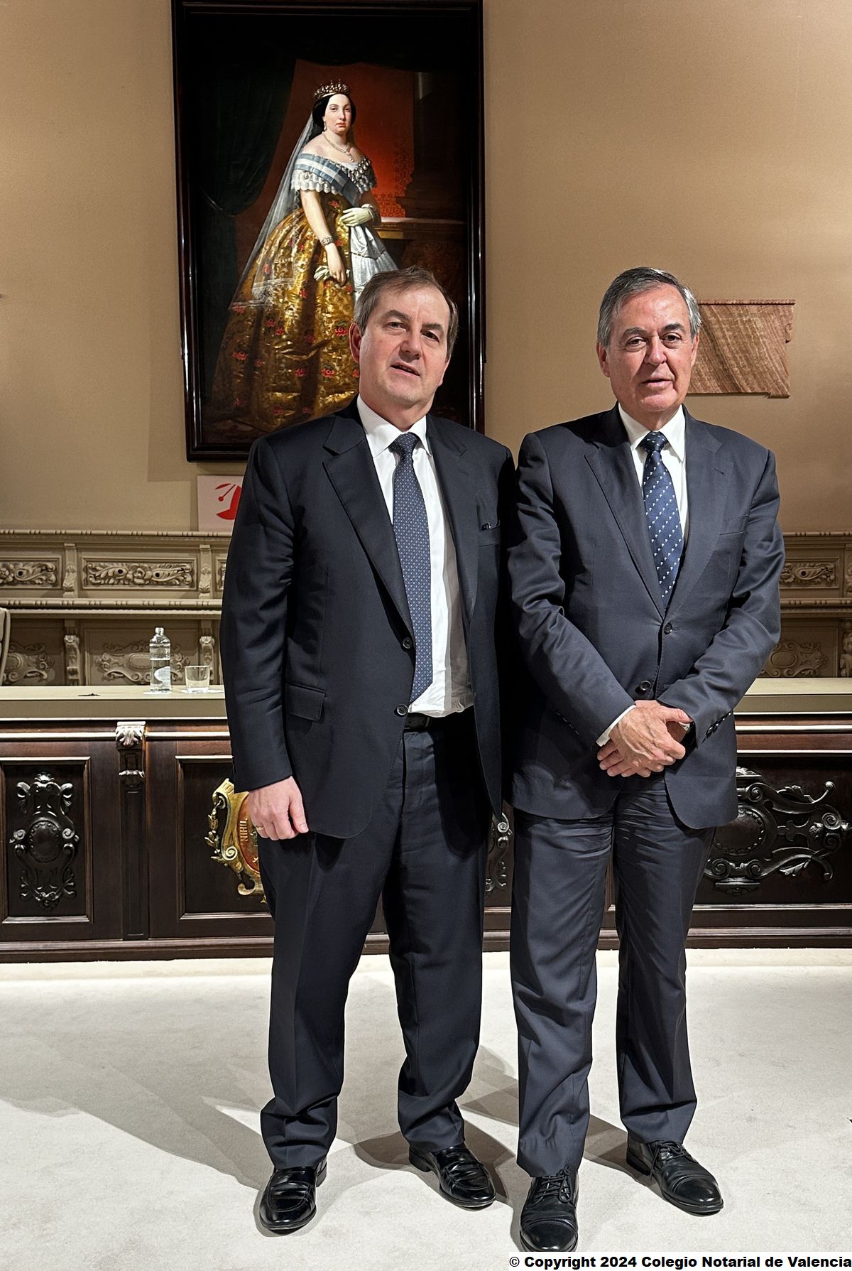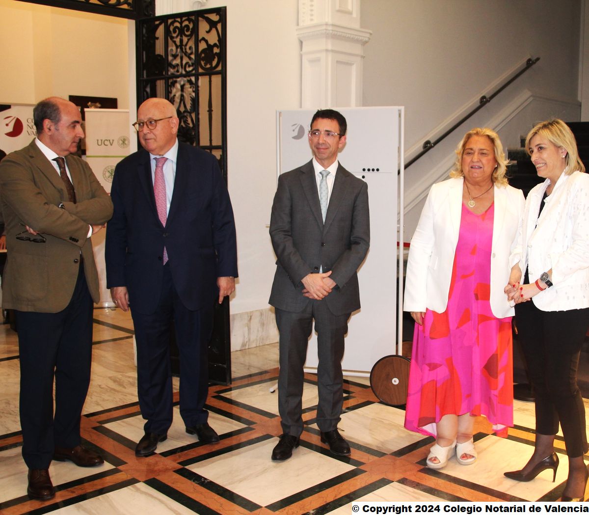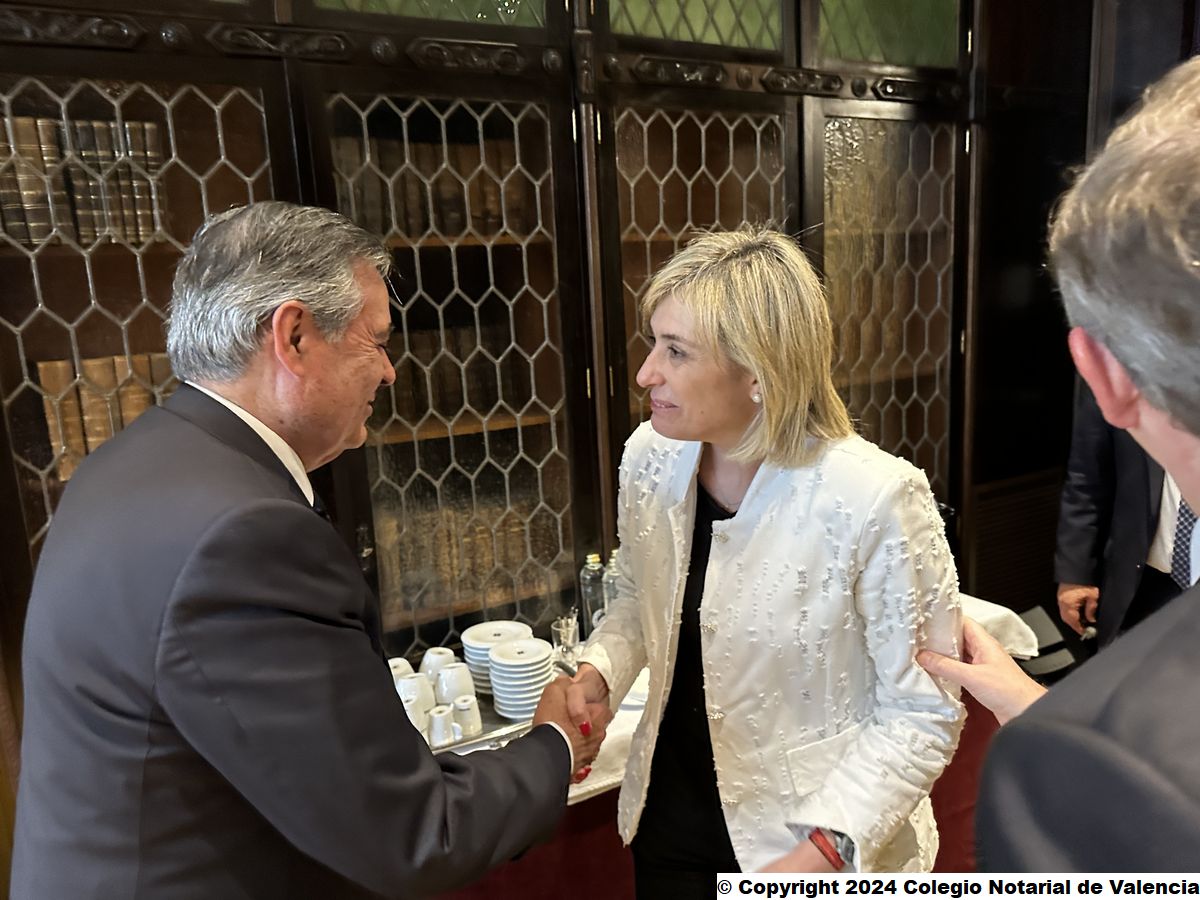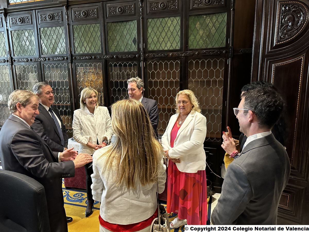 Imagen de la recepción de la consellera de Justicia, Elisa Núñez Sánchez; y de la primera teniente de alcalde del Ayuntamiento de Valencia, María José Ferrer San Segundo, por parte del censor 1º y del secretario de la Junta Directiva del Colegio Notarial de Valencia, José Carmelo Llopis Benlloch y José María Cid Fernández (respectivamente), así como por el director del IVEN, Eduardo García Parra