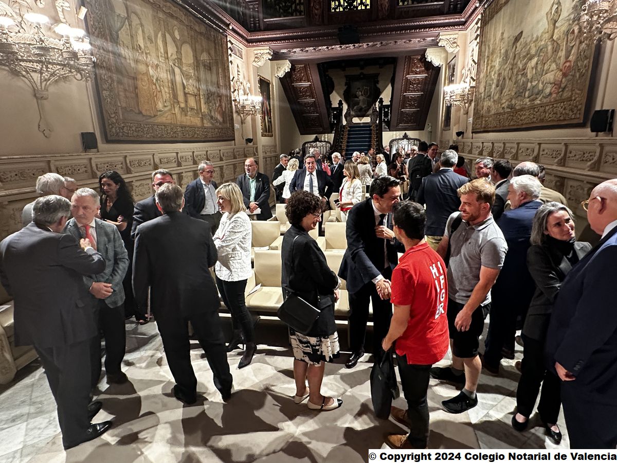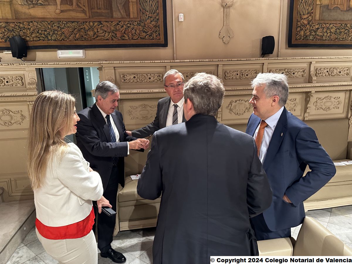 Momentos previos a la conferencia del catedrático Juan Emilio Iranzo Martín, con algunas de las autoridades asistentes, miembros de la junta directiva del Colegio Notarial de Valencia y cargos colegiales