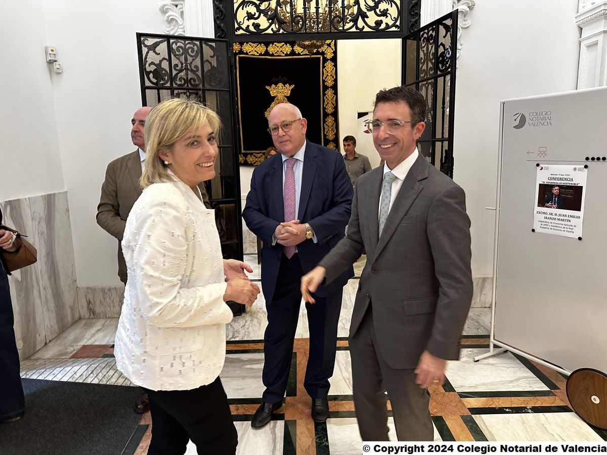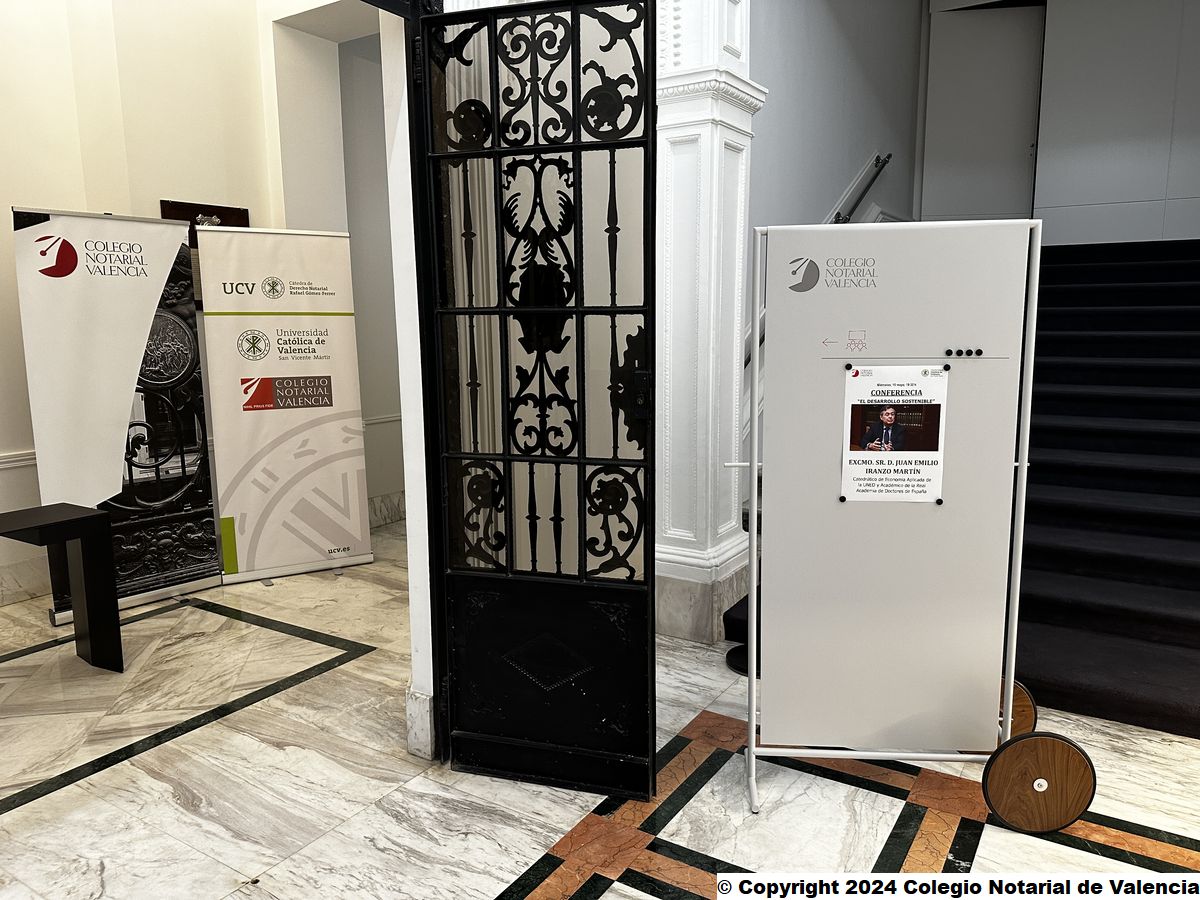 Imagen de la entrada a los Salones de Actos del Colegio Notarial de Valencia en el momento de la conferencia del catedrático de Economía Aplicada de la UNED y académico de Número de la RADE, Juan Emilio Iranzo Martín
