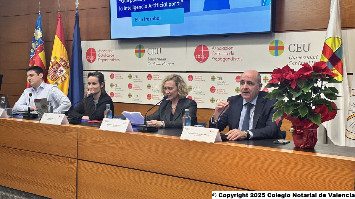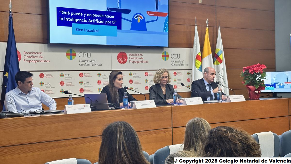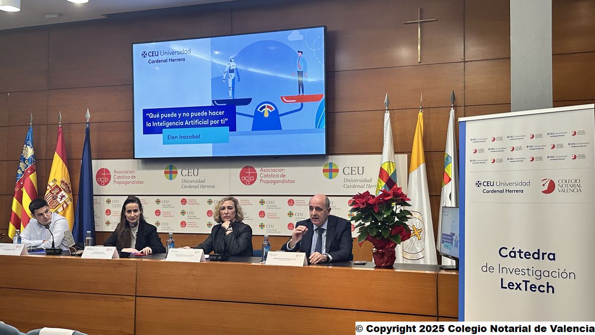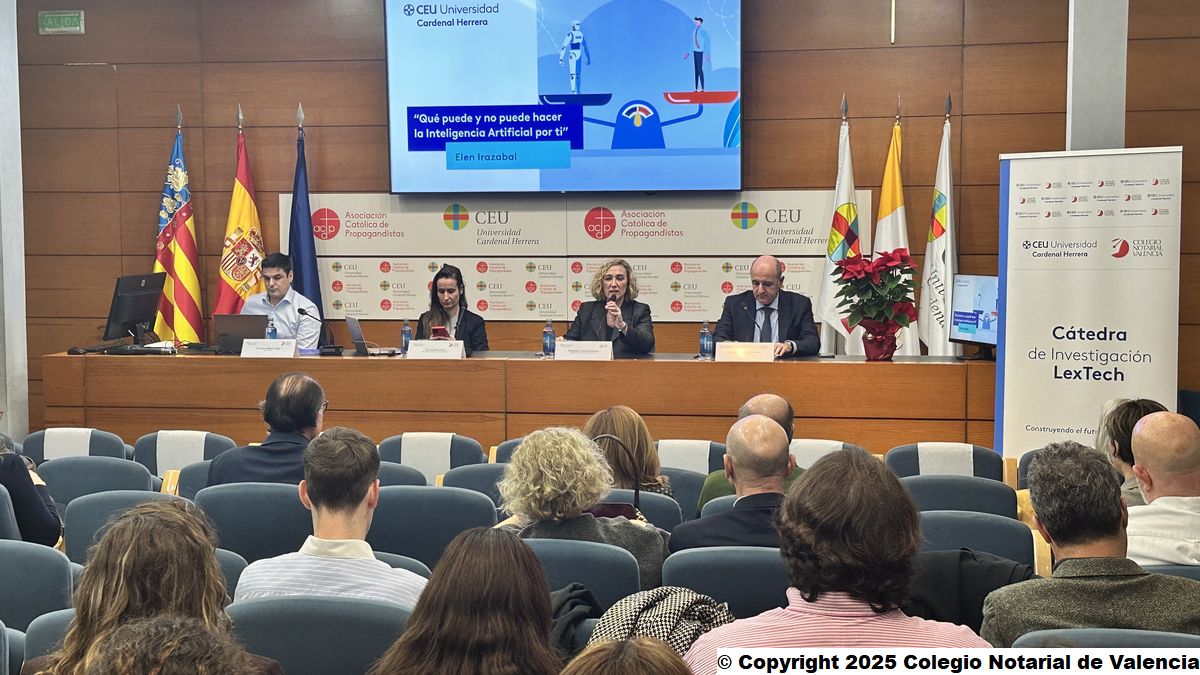 La Universidad CEU Cardenal Herrera y el Colegio Notarial de Valencia organizan la primera conferencia tras la presentación de la Cátedra LexTech de Derecho Privado y Transformación Digital, sobre los retos de la Inteligencia Artificial en el ámbito jurídico, dentro de su programación anual, de la mano de Elen Irazabal, abogada especializada en Inteligencia Artificial.