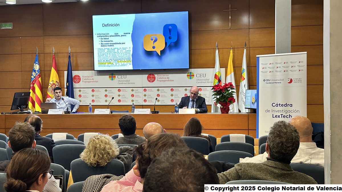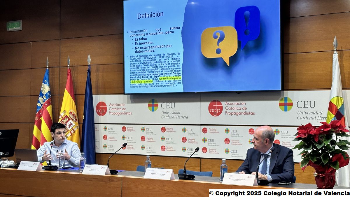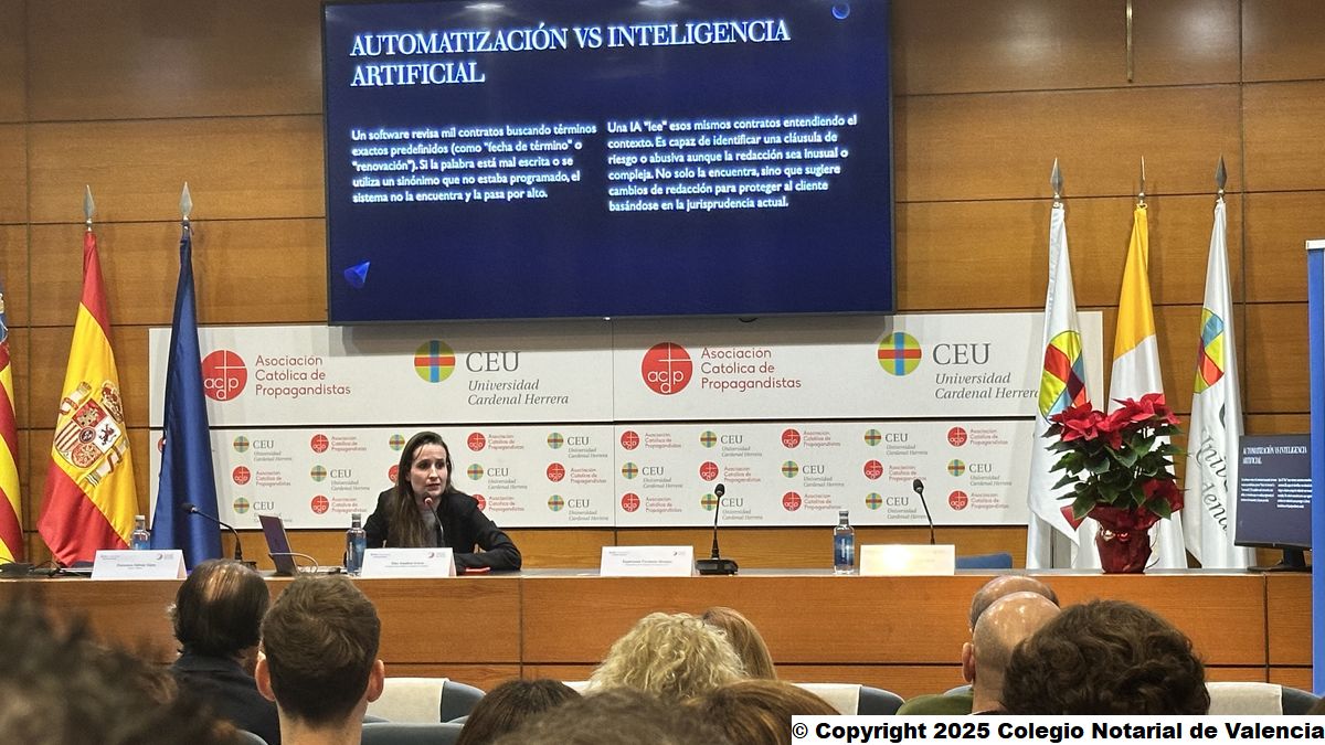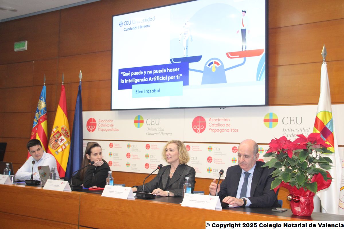 La Universidad CEU Cardenal Herrera y el Colegio Notarial de Valencia organizan la primera conferencia tras la presentación de la Cátedra LexTech de Derecho Privado y Transformación Digital, sobre los retos de la Inteligencia Artificial en el ámbito jurídico, dentro de su programación anual, de la mano de Elen Irazabal, abogada especializada en Inteligencia Artificial.