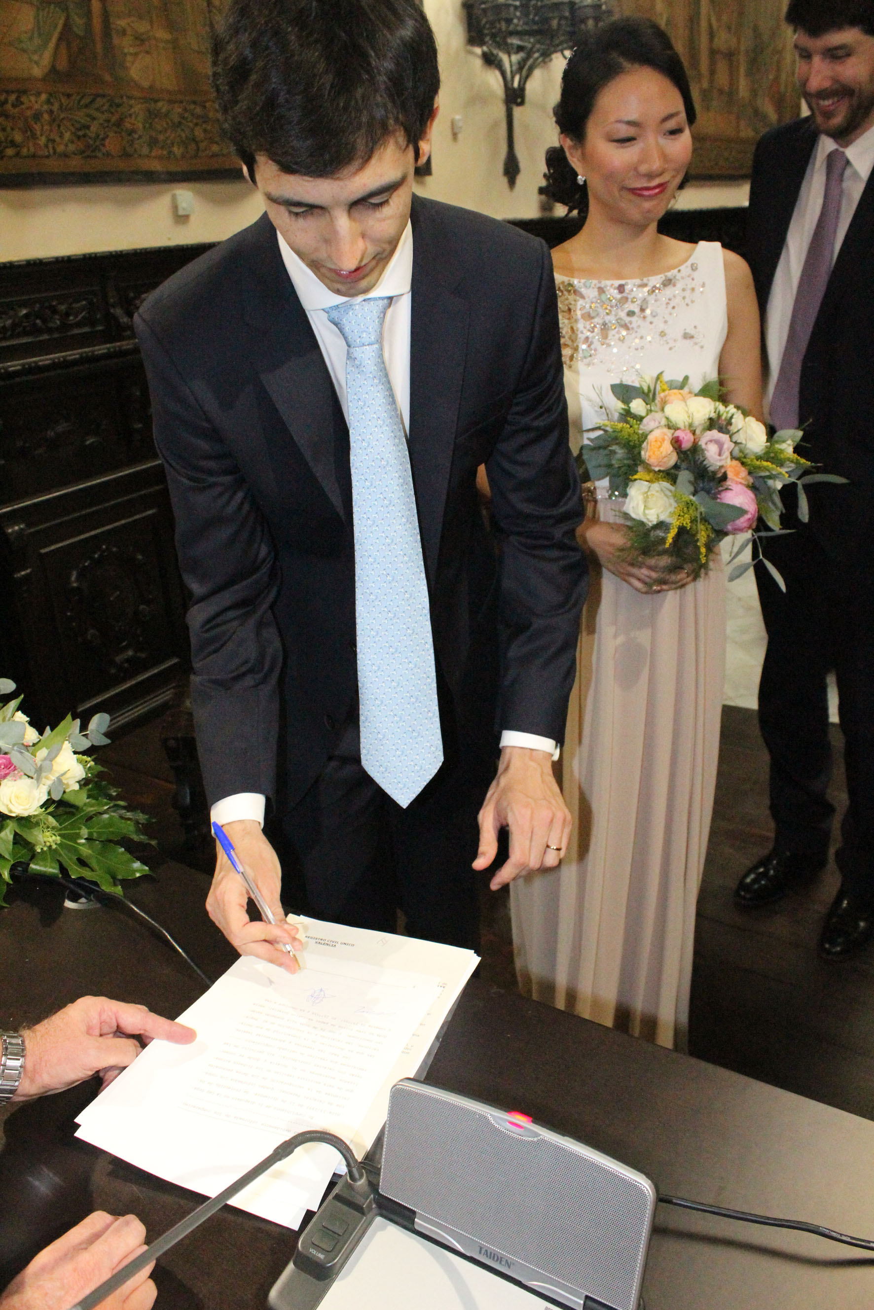 El majestuoso Salón de la Reina del Colegio Notarial de Valencia ha sido el lugar elegido por la pareja de novios Guillermo Soler y Yein Lee para celebrar su boda ante notario. En concreto, esta mañana, el edificio notarial en Valencia ha acogido su primer enlace ante notario. Desde la entrada en vigor de la Ley de Jurisdicción Voluntaria, en julio de 2015, y hasta marzo de 2017 han sido 483 las bodas oficiadas ante notario en la Comunidad