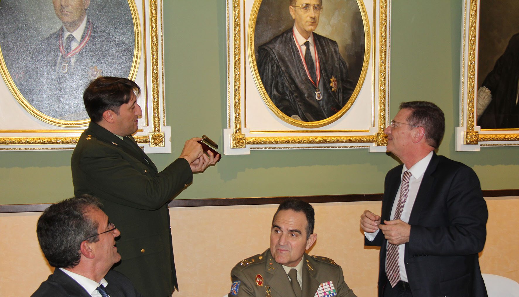 Como muestra de colaboración y buen entendimiento entre servicios públicos, en concreto a la función notarial, el comandante interventor Jesús de Salvador y Cerdán, responsable de la notaría militar en la Comunidad, hizo entrega al decano del Colegio Notarial de Valencia, Francisco Cantos, de un sello, como el utilizado en la misión española en Afganistán por los interventores en su función notarial, consistente en un casquillo de munición inutilizado.